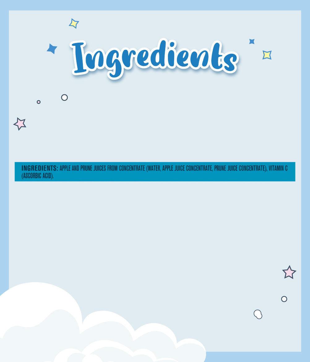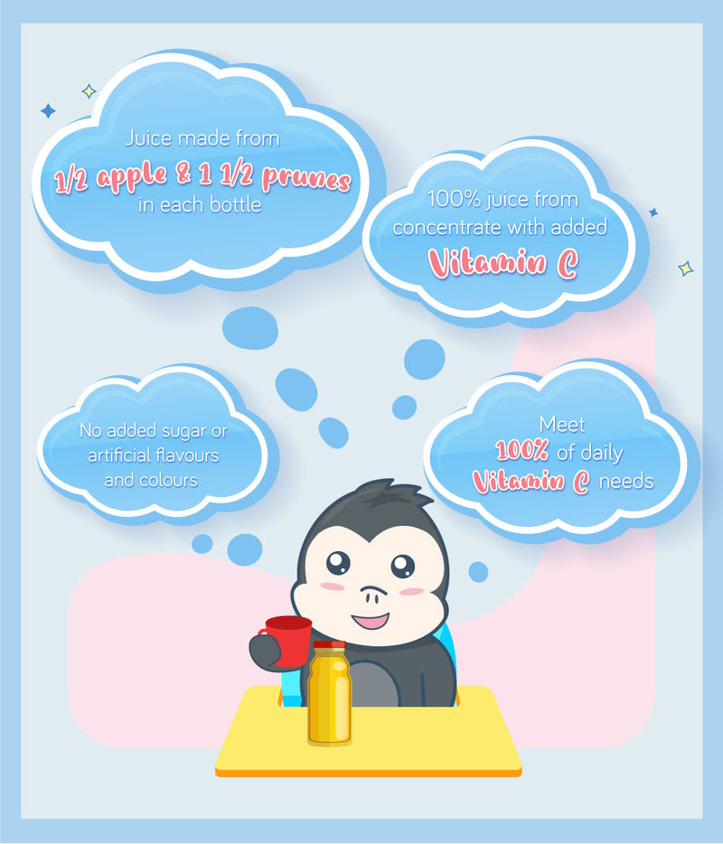 - Juice made from ½ apple and 1 ½ prunes in each bottle