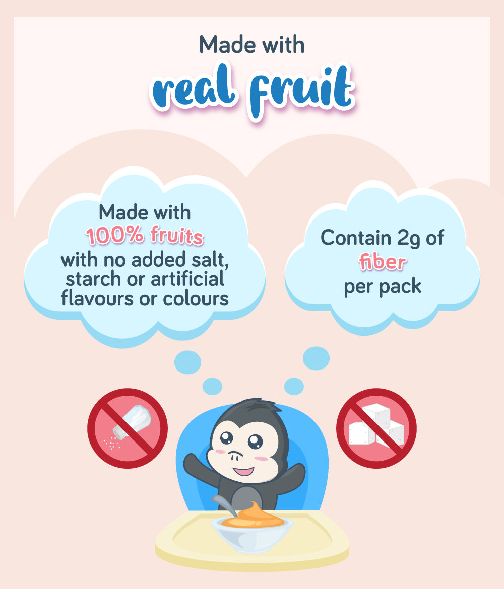 - Made with 100% fruits – with no added salt, starch or artificial flavours and colours.