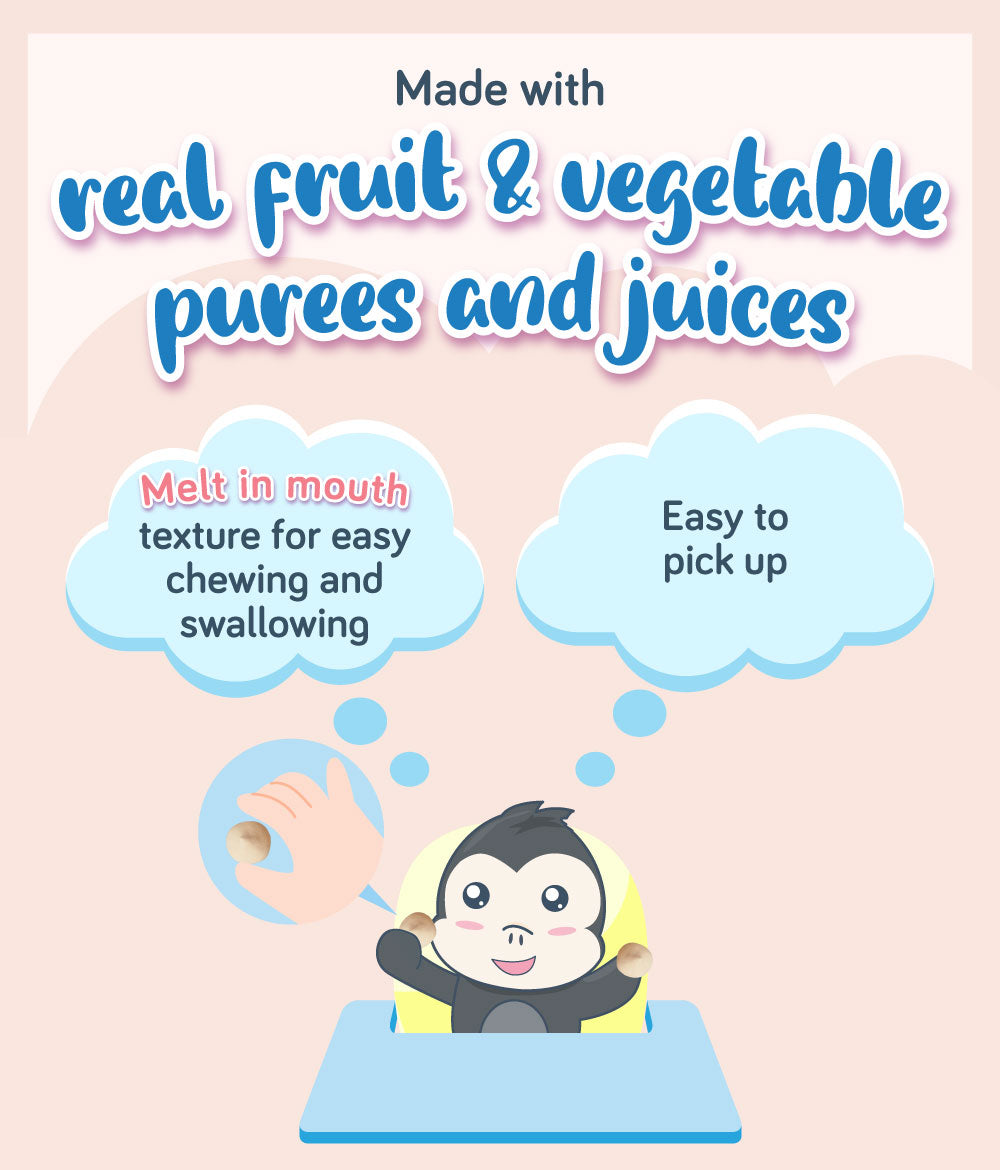 Made with real yogurt and fruit and melt-in-mouth texture for easy chewing and swallowing. Recommended for babies who are ready for finger foods and learning to self-feed themselves. Available in 28g pouch.