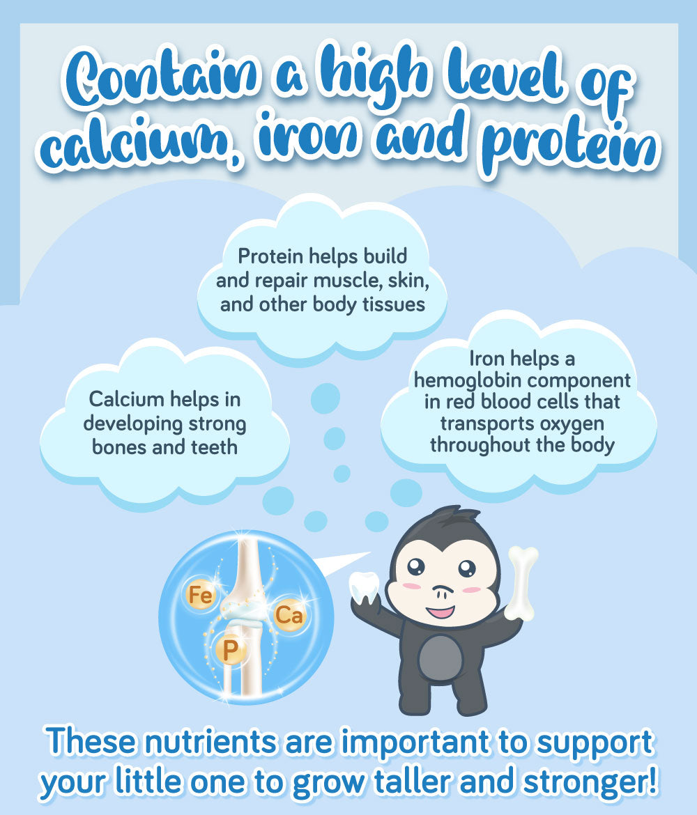 Contain a high level of calcium, Vitamin D and protein! These nutrients are important to support your little one to grow taller and stronger!