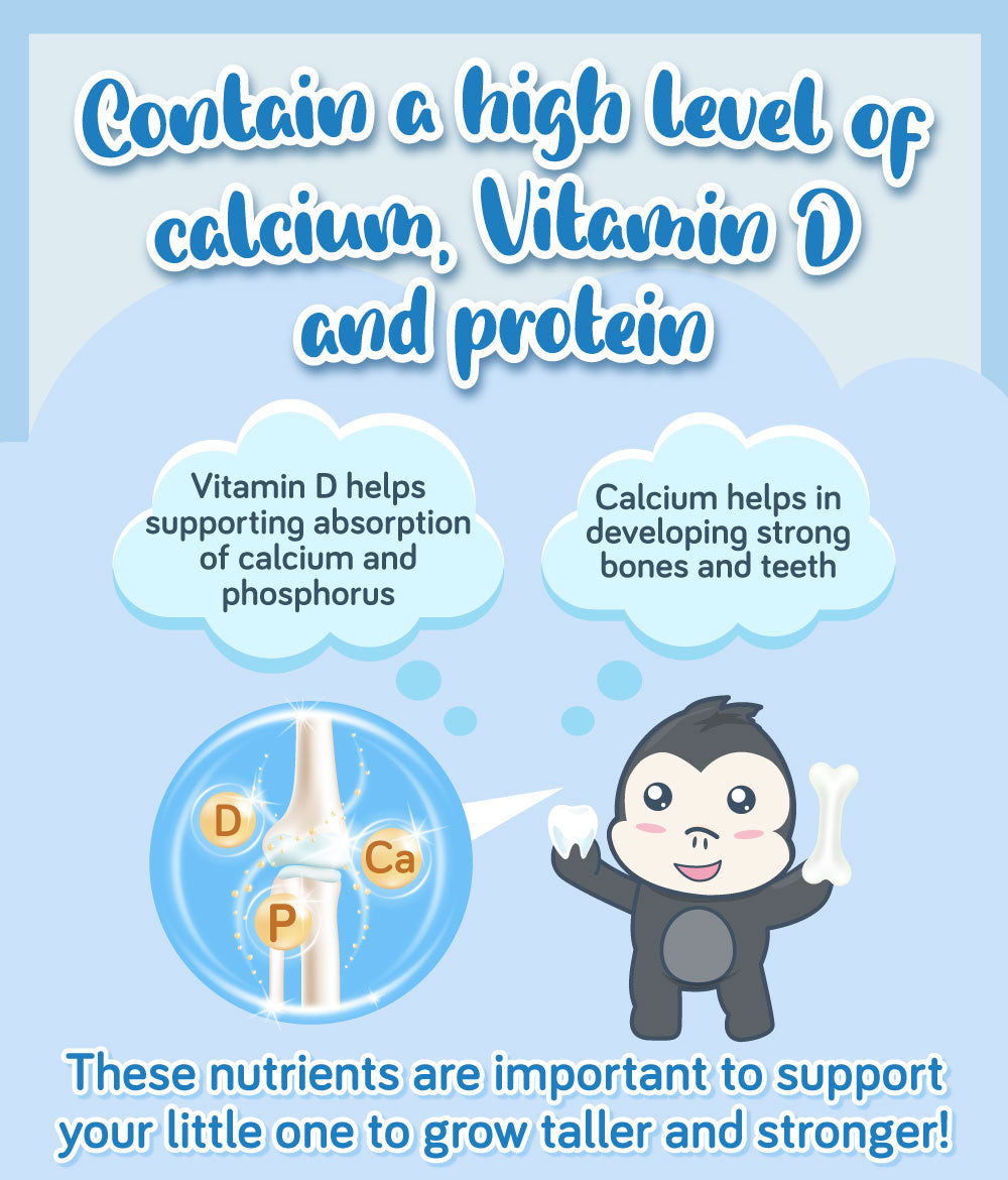 Contain a high level of calcium, Vitamin D and protein! These nutrients are important to support your little one to grow taller and stronger!